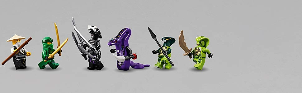 Wu, Lloyd, Lord Garmadon, Pythor, Spitta et Lasha, avec leurs armes.