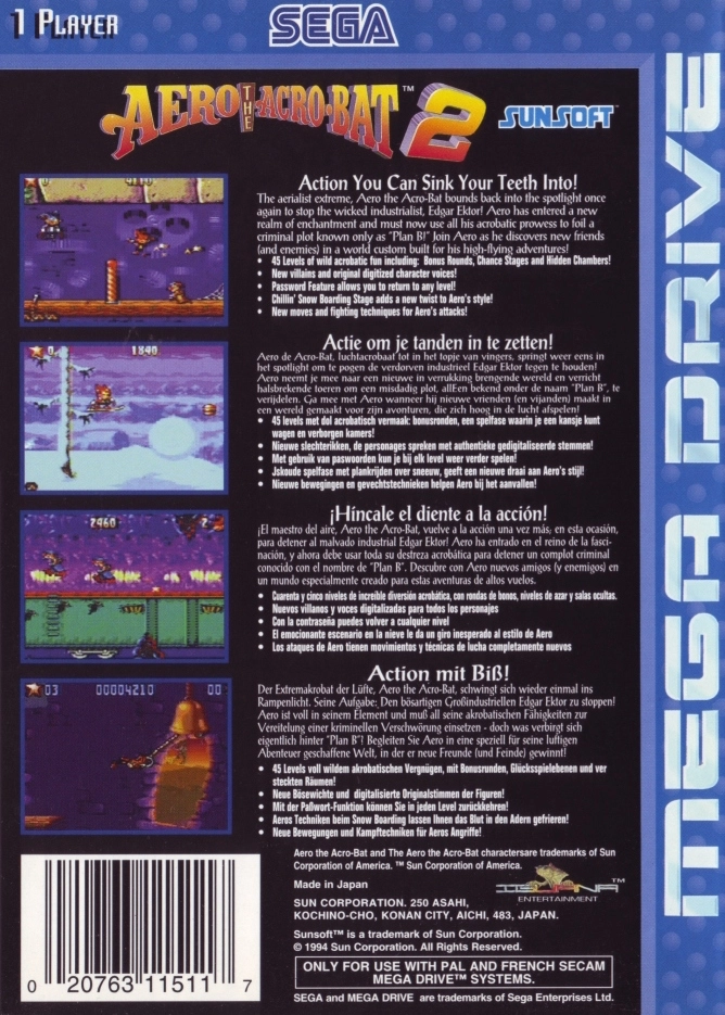 Aero the Acro-Bat 2 est la suite des aventures de la chauve-souris rouge sur Megadrive. Le clown Edgar Ektor a survécu et revient avec d'autres plans encore plus maléfiques. Aero quitte alors le cirque pour partir à sa recherche et le détruire pour de bon. En dehors du cirque, encore plus de machines et d'objets aident Aero à progresser dans les niveaux.