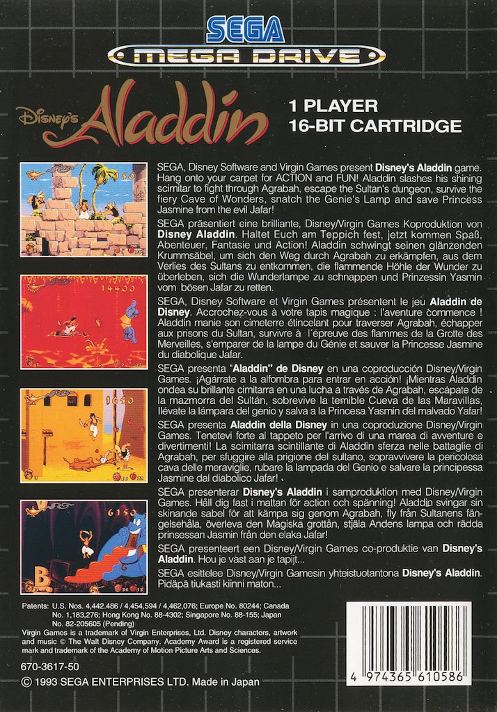 Ce jeu de plates-formes propose effectivement de suivre Aladdin des rues d'Agrabah aux couloirs du palais royal en passant bien sûr par la célèbre caverne aux merveilles. Le Génie est aussi de la partie et permet de gagner des bonus.