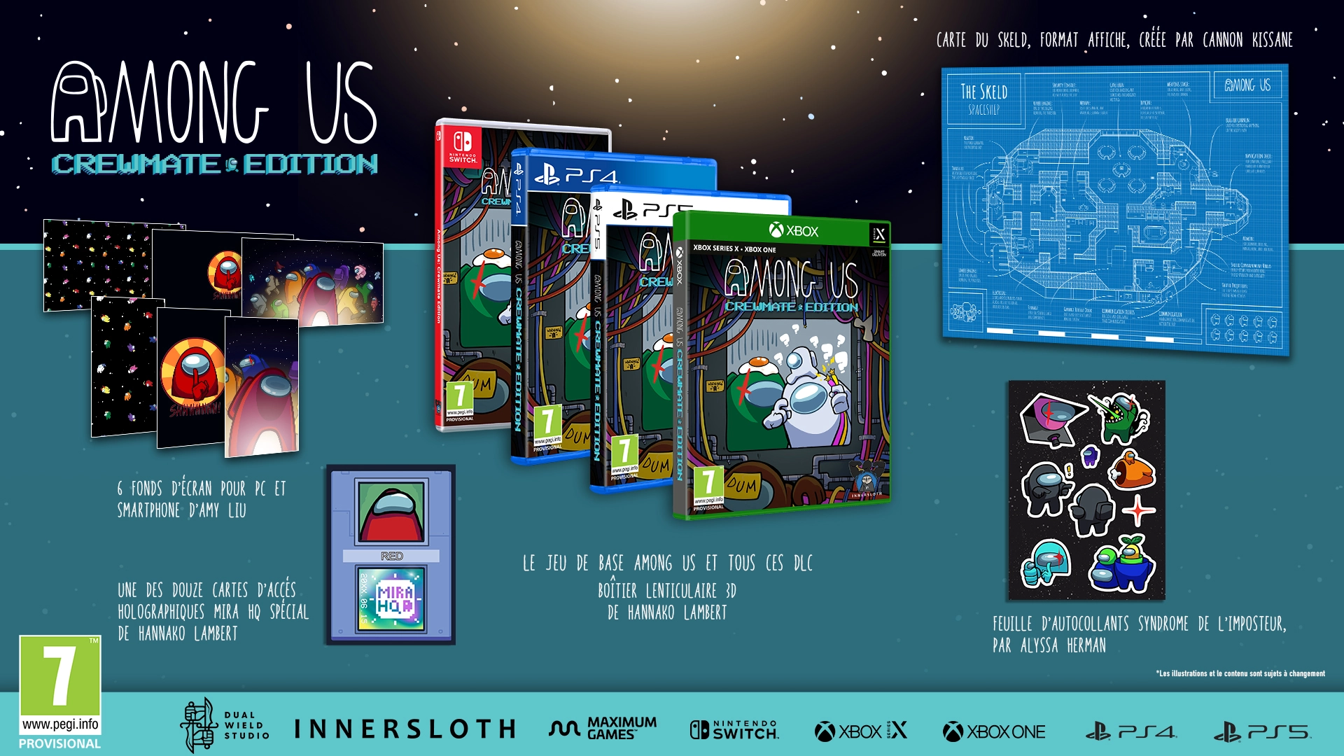 - Le jeu de base Among Us et tous les DLC suivants : Packs de skins Airship, Polus et MIRA HQ ; packs de bestioles Hamster, Krabouille, Poulpe, Stickmin et pack Mini-coéquipier.