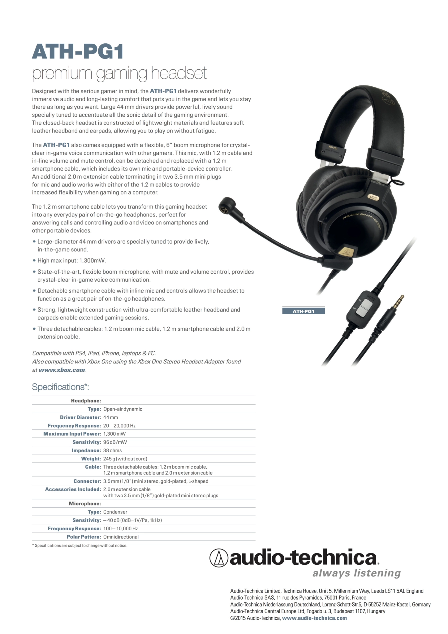 Le casque fermé en matériaux légers est équipé d’un serre-tête et de coussinets d’oreille en cuir doux, permettant de jouer sans fatigue. L’ATH-PG1 est également doté d’un microphone à tige flexible de 6” pour une communication vocale pure avec les autres joueurs.