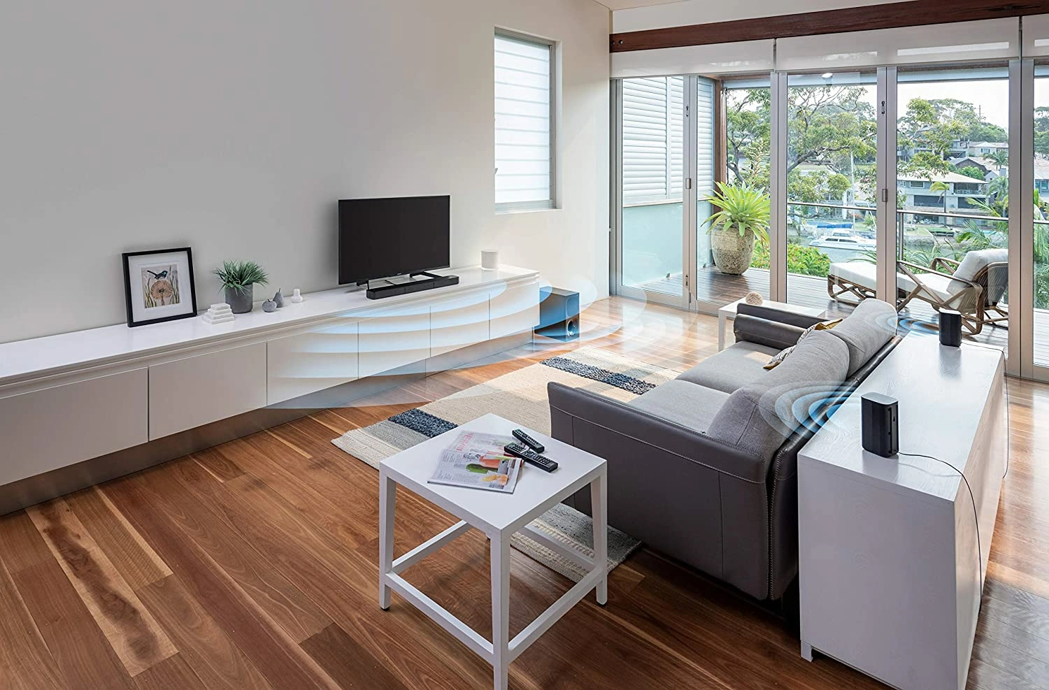 - Vous pouvez facilement sélectionner votre mode de son favori (Standard/Cinéma/Musique/Auto) via la télécommande ou directement sur les touches tactiles du caisson de basses, et visualiser les réglages utilisés (affichage LED)