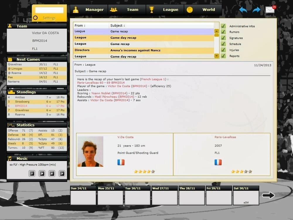 - Gestion des tactiques, des entraînements, des feuilles de match, de la salle