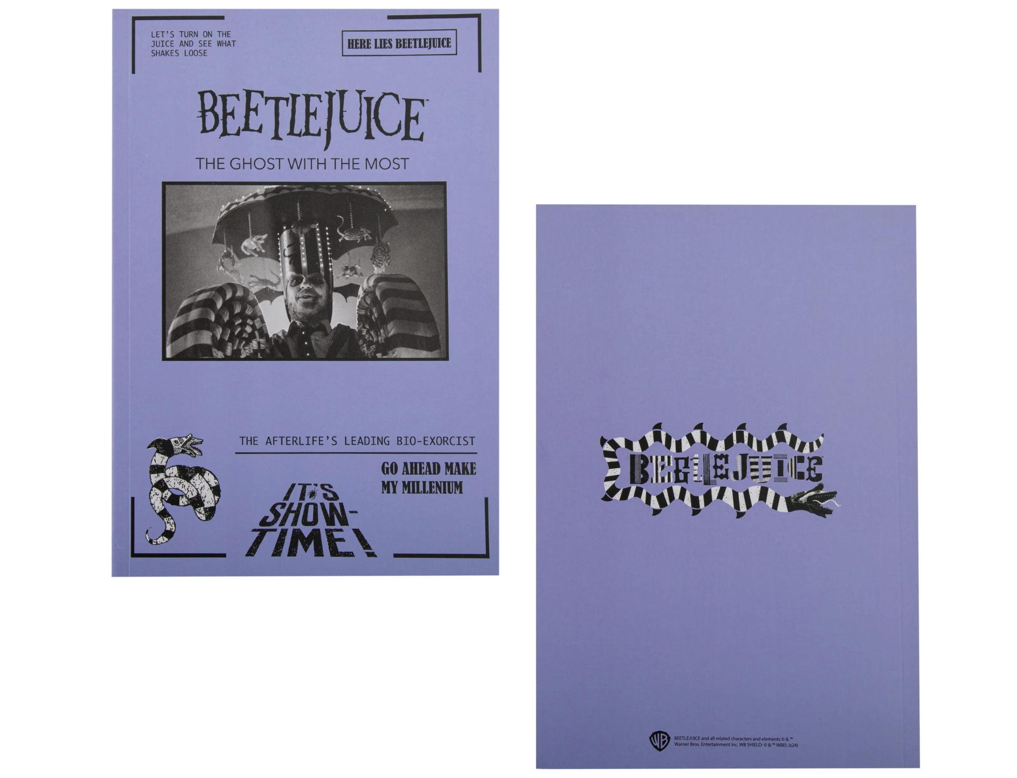 Ce carnet à couverture souple "It's Show Time" est un hommage fantaisiste à l'univers excentrique et charismatique de Beetlejuice. Le carnet lilas est orné d'une image frappante en noir et blanc de Beetlejuice portant un manège sur la tête, incarnant l'essence même de son excentricité.