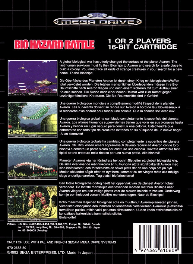 Une armée de mutants génétiquement modifiés terrorise le monde et met en péril le futur de la planète dans Bio Hazard Battle sur Megadrive. A travers 8 niveaux d'action intense, vous êtes confronté à quelques-unes des plus viles créatures jamais rencontrées. Vous disposez de 4 Biovaisseaux de combat, chacun se manipulant différemment et possédant son propre arsenal de guerre. Votre mission vous mène dans des mines caverneuses, les fonds de l'océan et au Laboratoire de guerre Biologique.