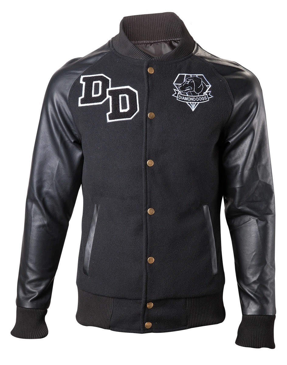 Blouson Teddy avec manche en simili cuir à l'effigie de Big Boss de Metal Gear Solid 5 en Taille M. Le logo des Diamond Dogs est illustré au niveau du Cœur et au dos on retrouve le nom Big Boss et le chiffre 84 en référence au personnage de John dans le jeu vidéo.