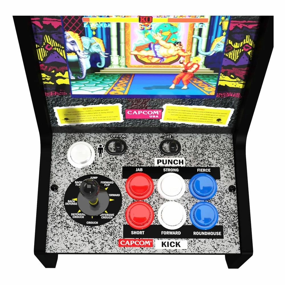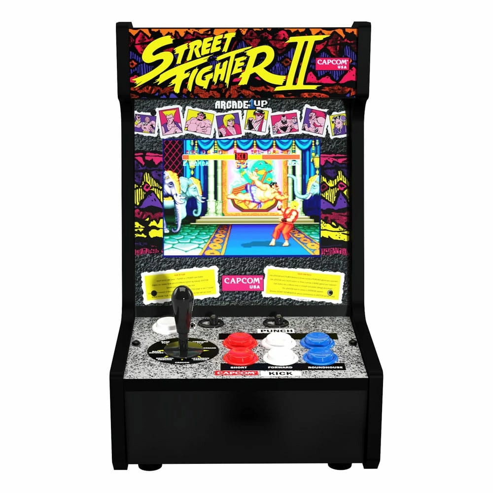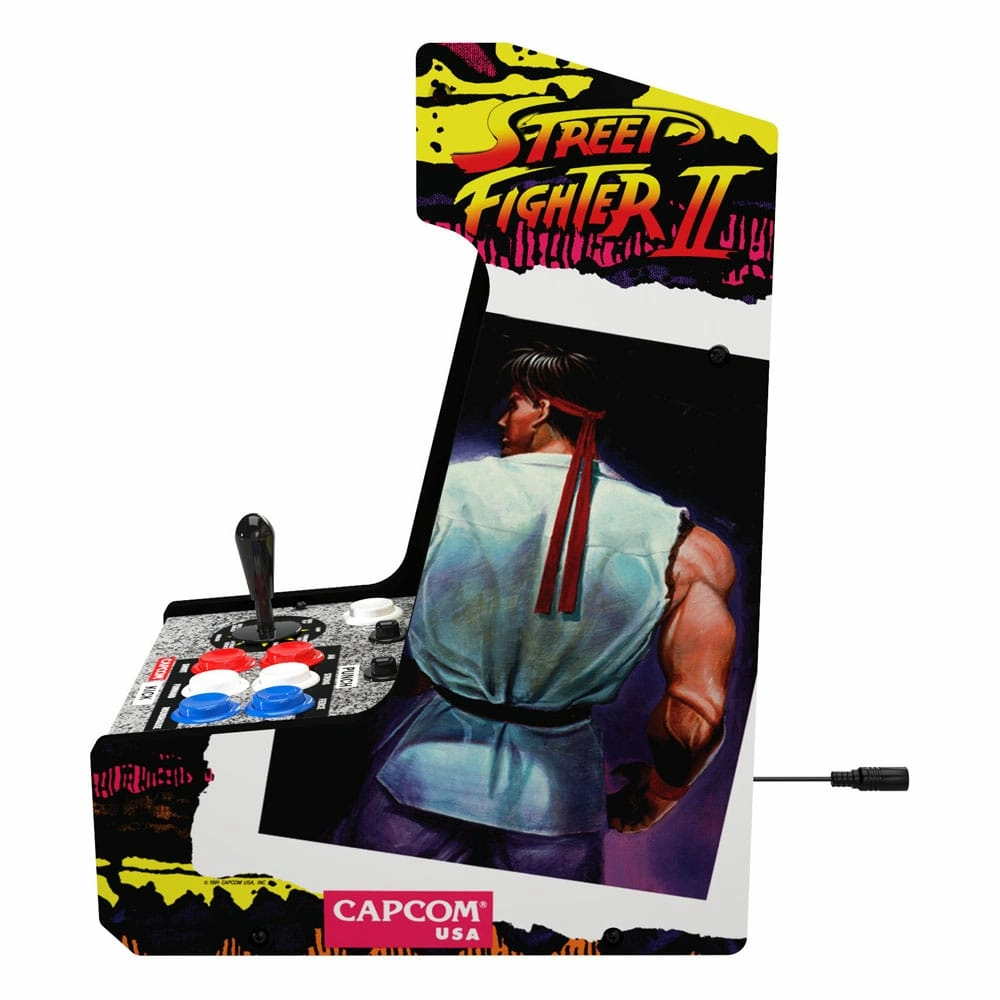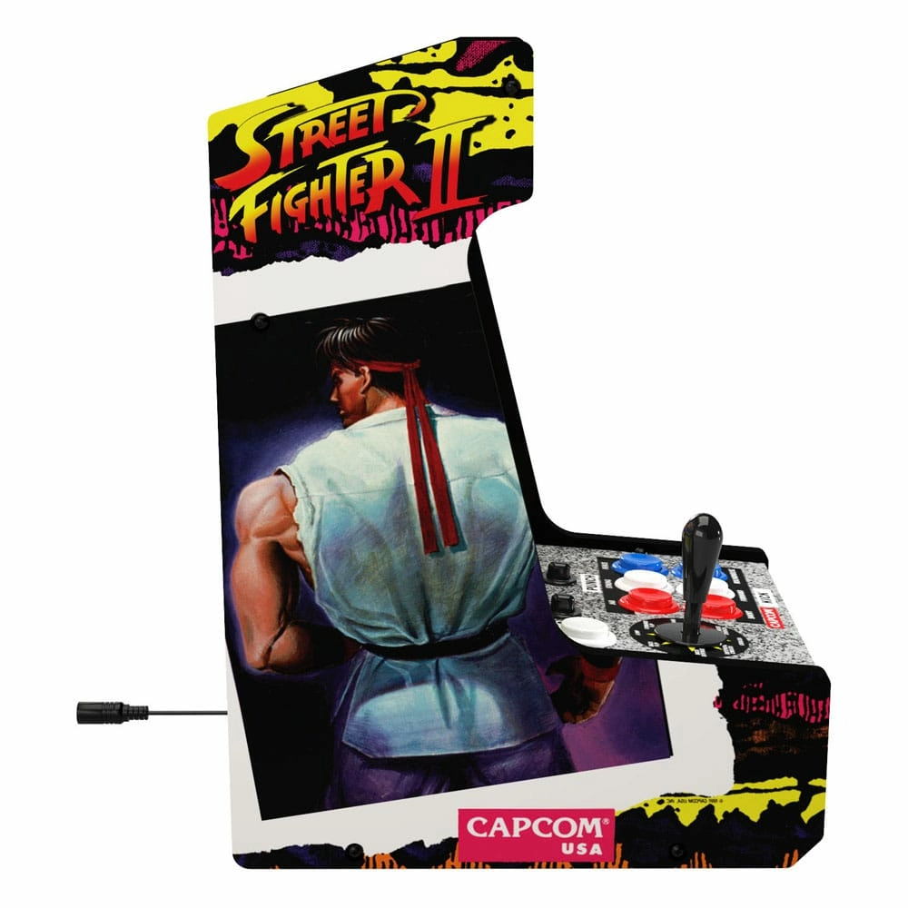Avec une hauteur de 40 cm, cette mini borne à poser sur un support (table, bureau, etc.) vous procure tout le plaisir du jeu d'arcade pour un budget et un encombrement moindres !Chaque borne contient plusieurs titres légendaires et arbore un décor rétro du jeu-titre. Il n'y a pas de monnayeur, vous pouvez jouer quand et autant que vous le voulez.Cette borne contient les jeux suivants :- Street Fighter II- Street Fighter II: Champion Edition- Street Fighter II Turbo- Super Street Fighter II- Super Street Fighter II TurboCaractéristiques:- Dimensions : 24 cm P, 30 cm L, 40 cm H- Ecran LED couleur 8 pouces- Joystick et boutons authentiques- Pas de monnayeur- Volume sonore ajustable- Se branche sur le secteur- Ne nécessite aucun assemblage
