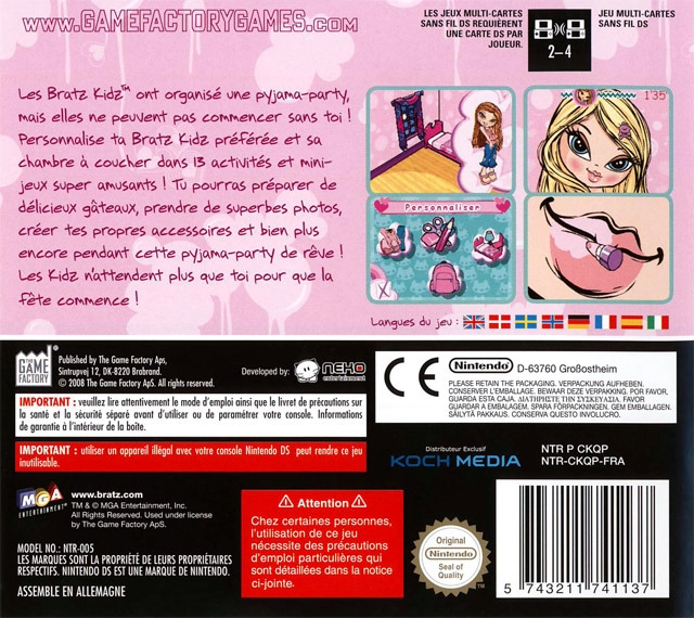 Bratz Kidz : Pyjama Party sur DS est un party-game mettant en scène les célèbres poupées mannequins. Grâce à la connexion sans-fil, plusieurs joueuses peuvent décider de s'affronter dans les 8 mini-jeux rassemblés. Ces derniers mettent à l'épreuve la rapidité, la mémoire, les réflexes et la précision des participantes.