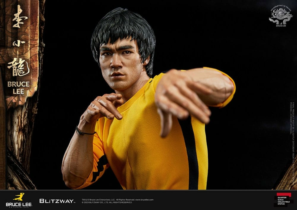 Statuette en résine et PVC à l´échelle 1/4, dimensions env. 55 x 36 x 32 cm avec diorama et vêtements en tissu détaillés sur socle décor. Modèle au niveau de détail exceptionnel, fini et peint à la main.Spécifications du produit :- Sculpture très détaillée à l'effigie de Bruce Lee- Vêtements conçus et taillés avec raffinement- Base en bois sur le thème de l'architecture orientale- 1 x Nunchaku- 1 x Baguette- 2 x drapeaux de diorama- 1 x Bracelet