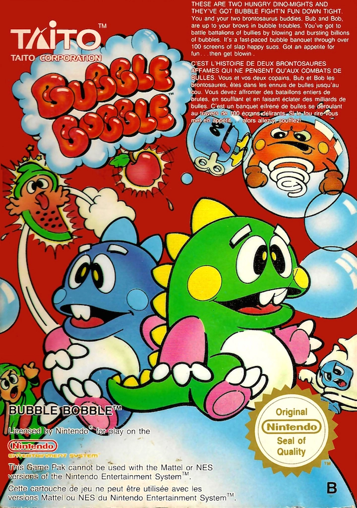 Bubble Bobble sur Nintendo Nes est un jeu de Plates-formes dans lequel on incarne Bub et Bob, deux enfants transformés en dinosaures qui vont devoir sauver leurs fiancées des griffes de Bubbla. Le jeu se déroule sur des tableaux dans lesquels apparaissent des ennemis qu'il faut emprisonner dans des bulles avant de les faire exploser pour récupérer des points, tout en prenant en compte les courants d'air susceptibles de faire dévier les bulles, le tout sur une centaine de niveaux.