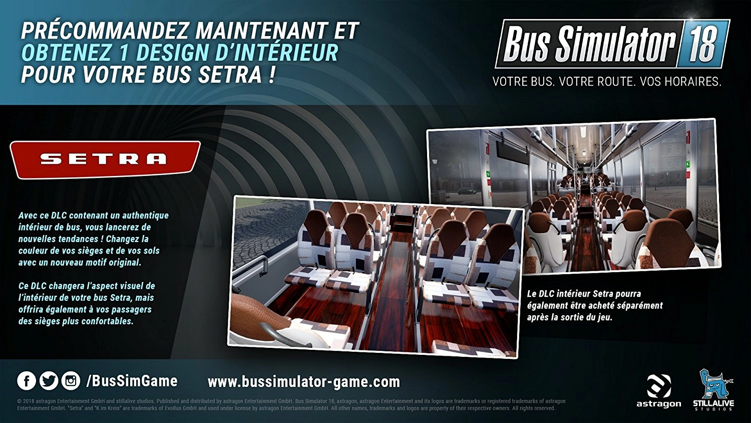 Dans Bus Simulator 18, vivez au plus près la vie d’un chauffeur de bus en ville dans un vaste monde ouvert urbain. Vous découvrirez de nombreux décors comme les zones portuaires ou industrielles, le centre-ville ou le quartier des affaires ! Mettez-vous au volant de 8 véritables autobus de grandes marques comme Mercedes-Benz, Setra, MAN et IVECO BUS et soyez à l’heure pour emmener vos passagers en toute sécurité jusqu’à leur destination. Vous pourrez jouer seul dans le mode solo ou avec vos amis dans le mode multi.