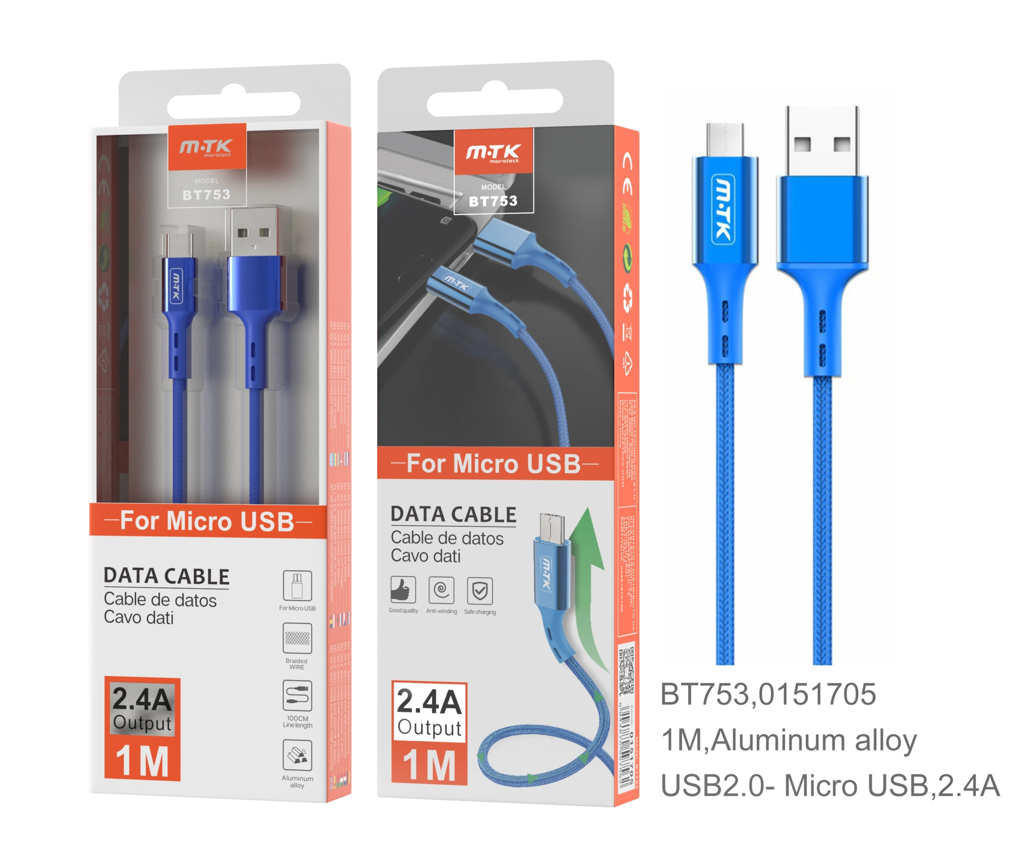 Câble en aluminium micro usb - 1m 2a - bt753 bleu