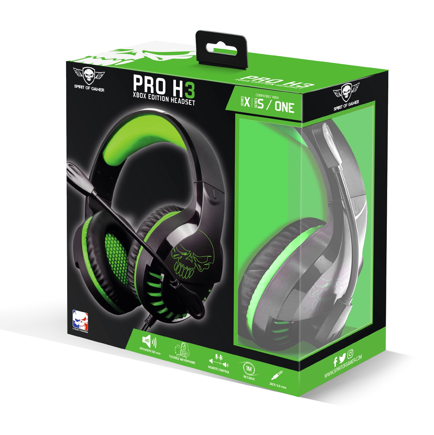édition Xbox, PRO H3 est compatible avec votre console Xbox Series X | S et Xbox One.Expérience de jeu améliorée : Vivez au c&oeligur de l'action, en immersion totale avec un son stéréo haute fidélité 2.0. Ses haut-parleurs de 50 mm offrent un son net pour que vous ne manquiez pas l'action et des basses profondes pour des explosions puissantes.Restez en contact avec votre équipe ! Microphone flexible antibruit pour des conversations claires et précises avec vos coéquipiers. Réglez le volume du casque et coupez le microphone avec votre télécommande filaire.Design Circumaural : Les oreillettes recouvrent les oreilles et leurs coussinets en cuir synthétique offrent un confort et une excellente isolation phonique. Le casque s'adapte à la forme de votre tête grâce à son bandeau réglable.Connectez-vous et combattez ! A vous de jouer, branchez son câble jack 3,5 mm (4 broches) de 1 mètre directement sur votre Xbox Series X | S et la manette Xbox One.Type de microphone : omnidirectionnel, flexible et rétractableCasque : 50 mmTélécommande intégrée : Filaire : Volume +/-Micro muetLongueur du câble principal : 1 mètreCâble(s) d'interface Jack 3,5 mm (4 broches)Compatibilité : Xbox Series X | S, Xbox One