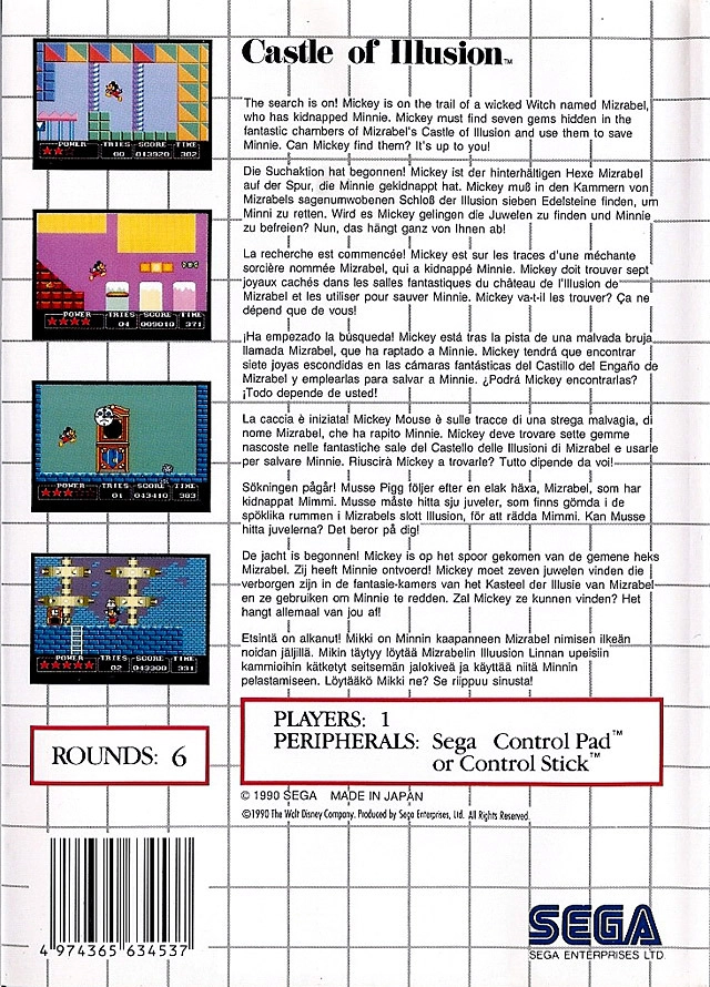 Castle of Illusion starring Mickey Mouse sur Master System est un jeu de plates-formes où vous devez sauver Minnie des griffes de la sorcière Mizrabel. Incarnez Mickey dans cette aventure où chacune des portes du château renferme bien des surprises.