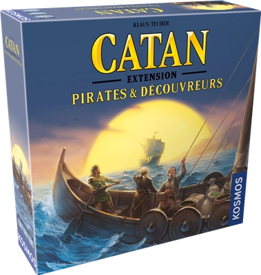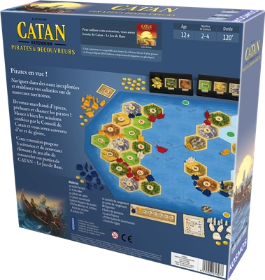Catan : Pirates & Découvreurs est la quatrième expansion majeure pour Catan (après Marins, Villes & Chevaliers et Barbares & Marchands) et comprend cinq scénarios et trois missions ; certains des scénarios font usage des missions et d'autres non.Catan : Pirates & Découvreurs diffère du jeu de base Catan de trois manières principales. Premièrement, au lieu d'avoir une seule île dans le jeu sur laquelle les joueurs construisent et rivalisent pour les ressources, trois îles sont présentes - mais le paysage d'une seule de ces îles est connu au début du jeu. Les joueurs commencent sur cette île, puis construisent des navires et font venir des colons pour qu'ils puissent ensuite voyager vers de nouvelles terres. Lorsqu'un navire termine son mouvement sur un territoire inexploré, cet hexagone est révélé et un jeton tiré au hasard y est placé, le joueur gagnant une ressource en récompense - en supposant que l'hexagone produit des ressources. (Le nombre de tuiles inconnues varie de 16 à 32, selon le scénario.) Un colon et un navire peuvent être transformés en une colonie portuaire, à partir de laquelle des routes et de nouveaux navires peuvent être construits pour permettre une exploration plus poussée.Deuxièmement, au lieu d'utiliser les villes, Catan : Pirates & Découvreurs permet aux joueurs de construire des colonies portuaires pour deux maïs et deux minerais, avec une colonie portuaire fournissant une ressource lorsque le nombre adjacent est obtenu au début d'un tour. Comme les villes, les colonies portuaires valent deux points de victoire (PV), et le nombre de PV requis pour gagner dépend du scénario.Troisièmement, si un joueur ne reçoit aucune ressource pendant le jet de production (autre qu'un 7), il reçoit un or en compensation. Deux pièces d'or peuvent être échangées avec la banque contre une ressource au choix du joueur. L'or a aussi d'autres utilisations, comme vous aider à échapper aux pirates.Les cinq scénarios inclus dans Catan : Les explorateurs et les pirates le sont :Terres en vue ! Explorez les mers de Catane et découvrez deux nouvelles îles pour agrandir vos colonies. Une fois que vous avez découvert une île, vous devez utiliser des navires pour transporter les colons d'une île à l'autre et coloniser des terres éloignées. (Scénario d'introduction)Le Repaire des Pirates ! Dans ce scénario, des pirates rôdent dans les mers avec vos navires de commerce. Payez un tribut aux pirates ou chassez-les, puis trouvez et capturez leurs repaires pour gagner de l'or et des PV ! (Scénario d'une mission)Du Poisson pour Catan ! Les habitants de Catan manquent de nourriture, il est donc temps d'aller pêcher dans l'océan pour manger. Ce sont des poissons d'eau profonde, cependant, donc vous devez d'abord trouver leurs bancs avant de pouvoir les attraper ! Le Conseil de Catan récompensera les joueurs avec des PV pour avoir ramené du poisson sur l'île, ainsi que pour avoir capturé des tanières de pirates. Méfiez-vous des pirates errants, car non seulement ils exigeront de l'or en guise de tribut, mais ils pourraient aussi atteindre le poisson avant vous ! (Scénario de deux missions)Des Epices pour Catan ! Dans ce scénario, le Conseil de Catane veut que vous trouviez du poisson et des épices pour les habitants de Catane ! Comme auparavant, ils récompensent les capitaines marchands les plus laborieux par des PV. Pour obtenir des épices, vous devrez vous lier d'amitié avec les mystérieux habitants des îles aux épices, mais en retour, ils ne vous échangeront pas seulement des épices, mais vous enseigneront leurs connaissances de la voile ou même des techniques de combat pirate ! (Scénario de deux missions)Explorateurs et Pirates ! Ce scénario long et stimulant réunit tous les éléments des scénarios précédents ! Explorez de nouvelles terres, capturez des repaires de pirates, trouvez des poissons, et faites connaissance avec les habitants des îles aux épices ! (Scénario de trois missions)