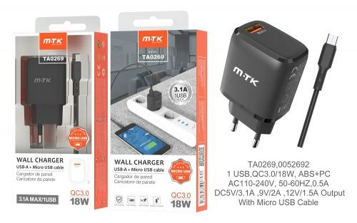 Chargeur secteur rapide red machine gun - 3.1a max - avec cable - 1usb - 18w- ta0268 - noir