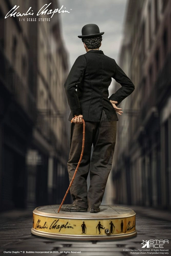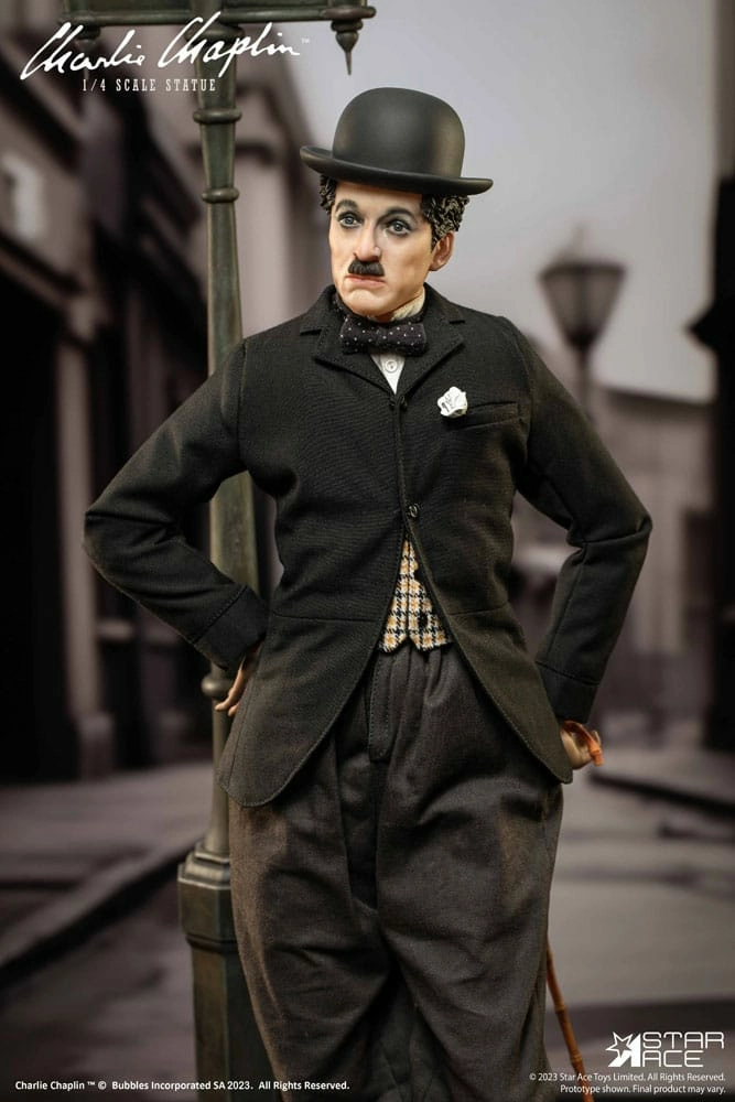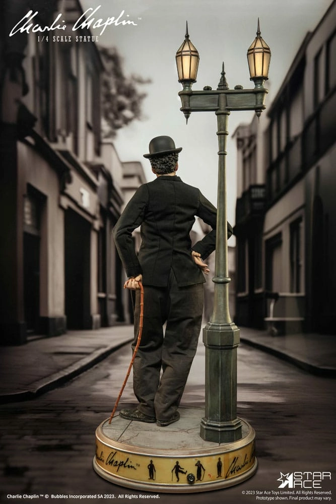 Statuette en resine à l´échelle 1/4 sur socle, taille env. 50 cm avec vêtements en tissu et de nombreux accessoires. Modèle fabriqué par Star Ace Toys. Avec éclairage LED.La version de luxe contient :- 1 x Statue de Charlie Chaplin- 1 x Socle (LED INER)- 1 x Bâton- 1 x Set de lampes (INER LED)