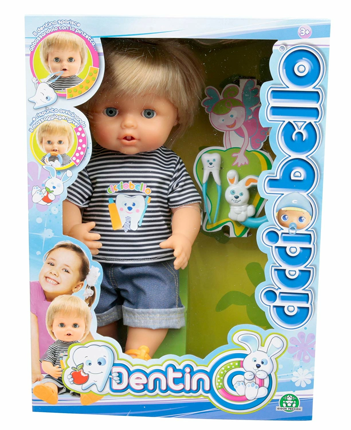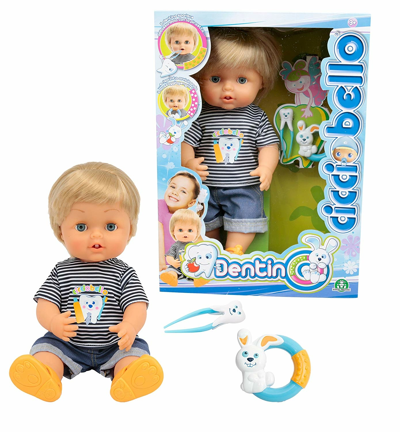 Cicciobello a une dent qui bouge et qui est prête à tomber! utilise la pince pour la retirer. Donne à Cicciobello son anneau de dentition et regarde... une nouvelle dent apparait comme par magie pour remplacer celle qui vient de tomber! de nombreux accessoires pour prendre soin des dents de ton Cicciobello pour un maximum de jouabilité! a toi de jouer au dentiste et de prendre soin de ton petit garçon! taille: 30 cm