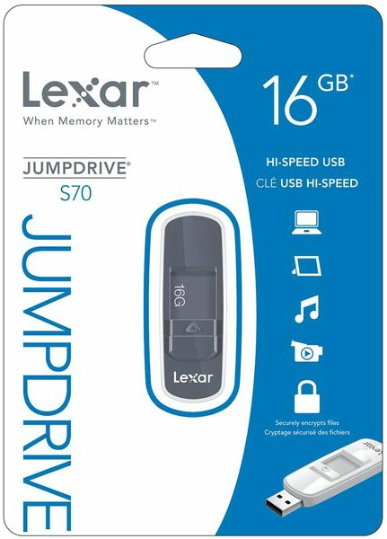 Grâce à des fonctions de sécurité avancée, le lecteur flash USB 2.0 16 Go Lexar JumpDrive S70 constitue une solution de stockage portable fiable et pratique pour la vie nomade. Ce lecteur USB haute vitesse avec connecteur rétractable en un coup de pouce fournit une excellente solution pour le stockage, le transfert et le partage en toute sécurité de vos fichiers, vos photos, vos vidéos, et bien plus. Le lecteur flash USB JumpDrive S70 de Lexar est disponible dans une large gamme de capacités allant de 4 à 64 Go.