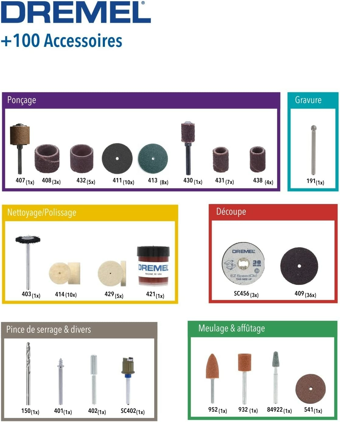 Le set d'accessoires multifonctions Dremel 100 comprend 100 accessoires d'origine Dremel dont le système EZ SpeedClic pour un changement rapide et simple des accessoires. Avec ce set d'accessoires, vous allez pouvoir réaliser de nombreuses tâches sur les matériaux les plus divers.