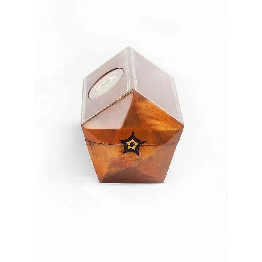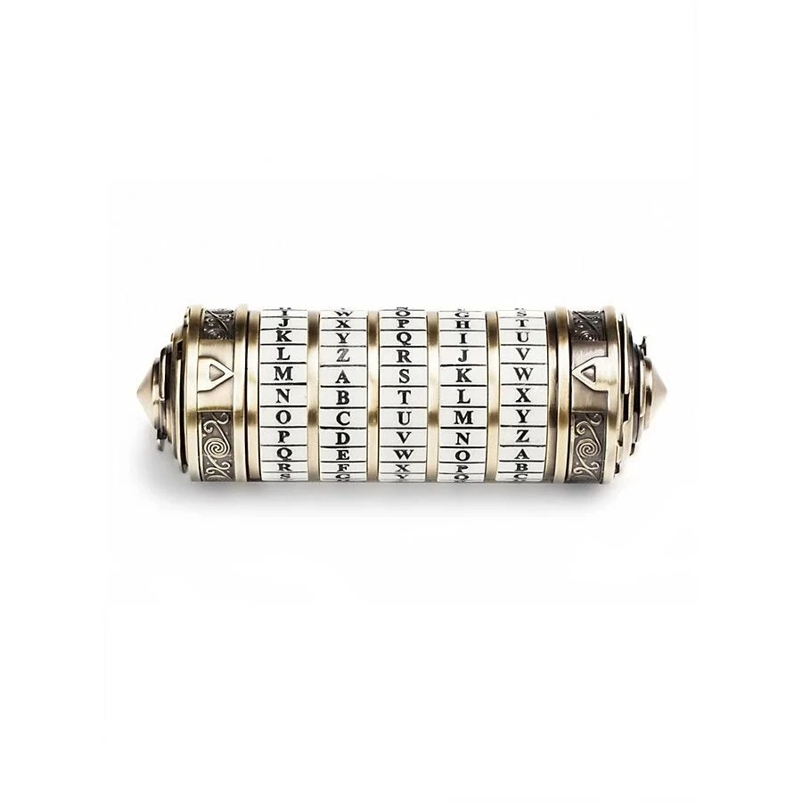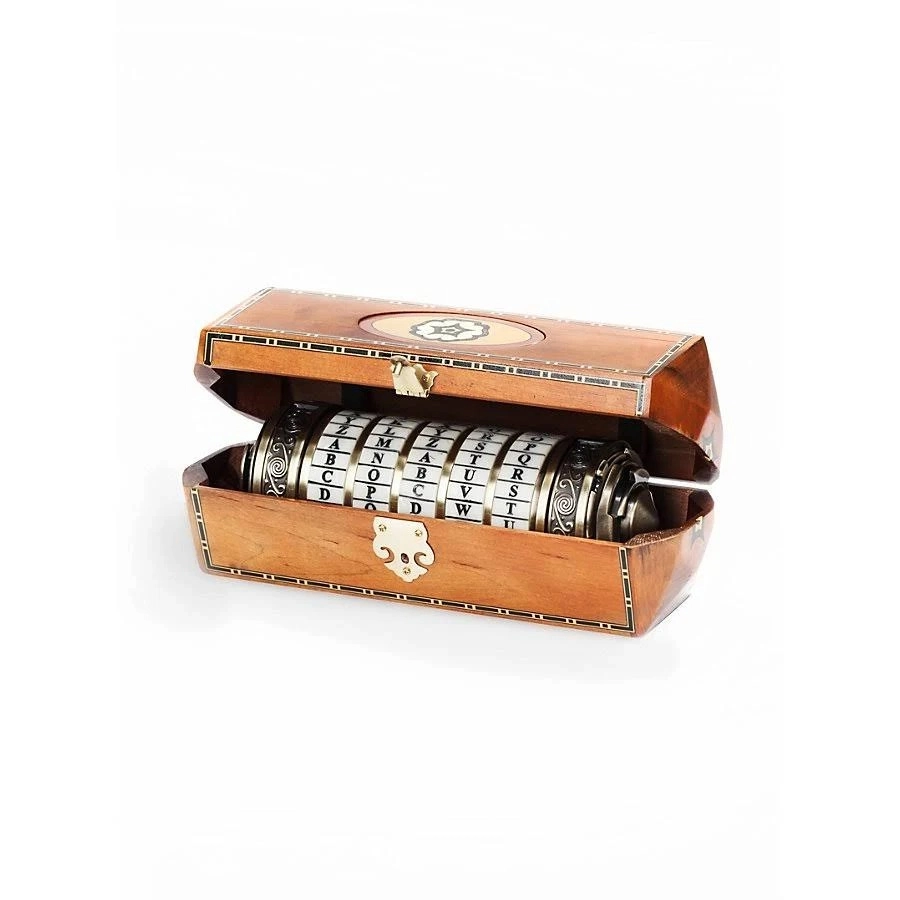 Réplique taille réelle en métal taille env. 16 cm, finition or vieilli. S´ouvre grâce à un code secret (peut être changé). Le compartiment caché mesure env. 13 x 6,5 cm. La longueur totale du Cryptex est d´env. 10 cm. Livré en coffret bois collector.