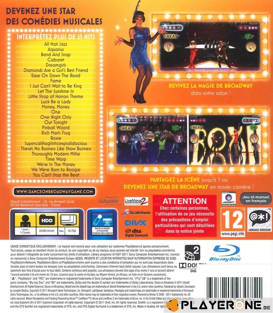 Avec le jeu de danse Dance on Broadway sur PS3, retrouvez toute la magie des scènes de Broadway chez vous ! Les plus grandes comédies musicales sont désormais à portée de main (Fame, West Side Story, Moulin Rouge ou encore Cabaret). Vous pourrez interpréter 20 titres tout en dansant !