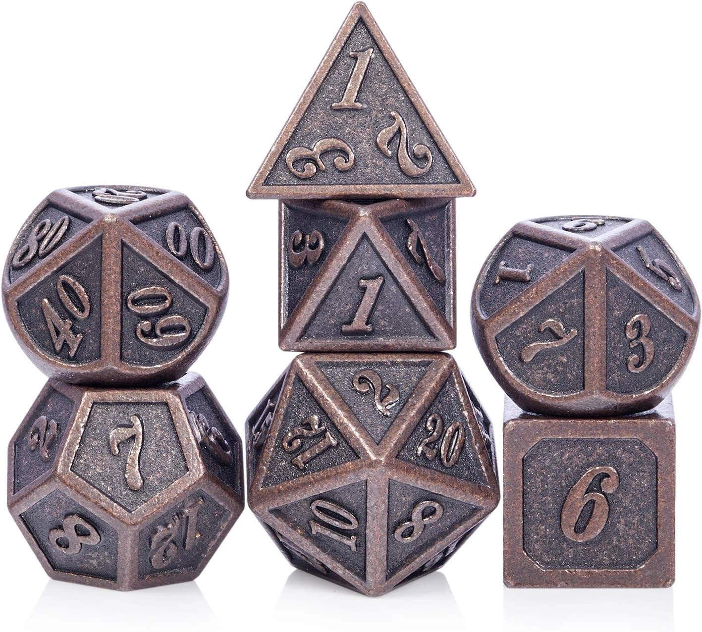 Set de 7 dés métal1 x D41 x D61 x D81 x D10 (unité)1 x D10 (dizaine)1 x D121 x D20Taille D6 pour référence : 14mmBoîte de rangement acrylique fourni (ref. 610300)