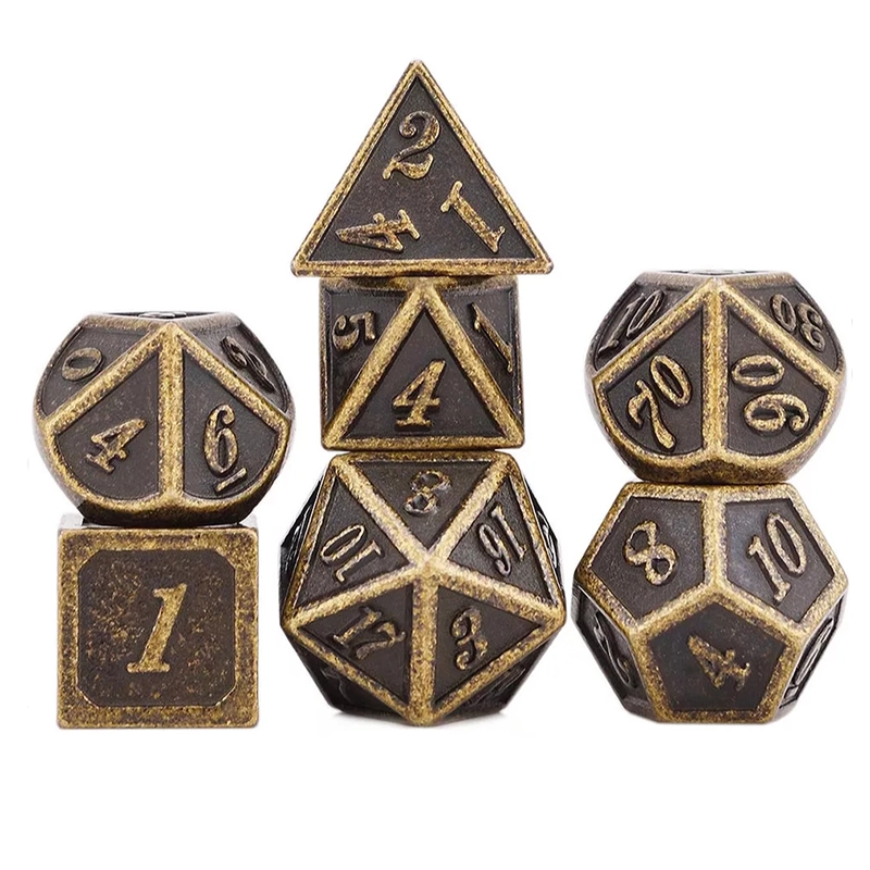 Set de 7 dés métal1 x D41 x D61 x D81 x D10 (unité)1 x D10 (dizaine)1 x D121 x D20Taille D6 pour référence : 14mmBoîte de rangement acrylique fourni (ref. 610300)