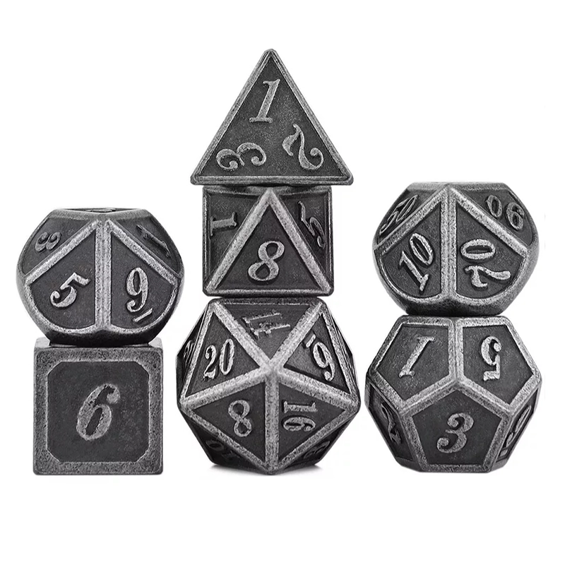 Set de 7 dés métal1 x D41 x D61 x D81 x D10 (unité)1 x D10 (dizaine)1 x D121 x D20Taille D6 pour référence : 14mmBoîte de rangement acrylique fourni (ref. 610300)