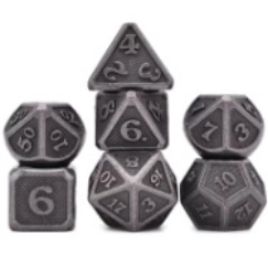 Set de 7 dés métal1 x D41 x D61 x D81 x D10 (unité)1 x D10 (dizaine)1 x D121 x D20Taille D6 pour référence : 14mmBoîte de rangement acrylique fourni (ref. 610300)