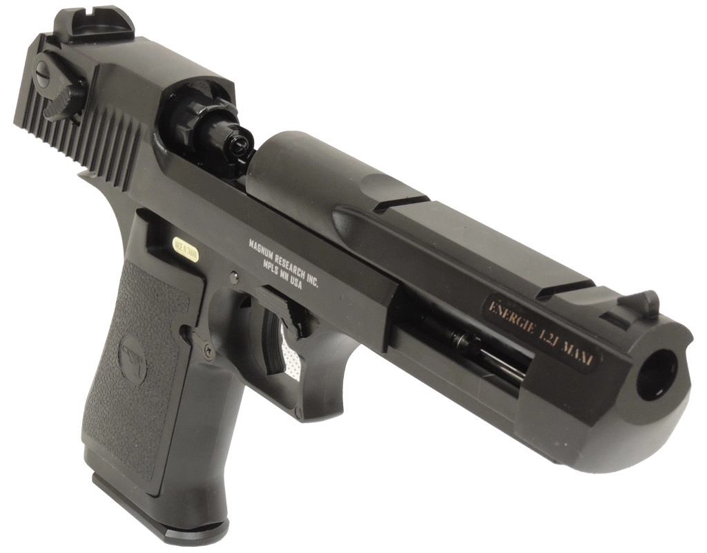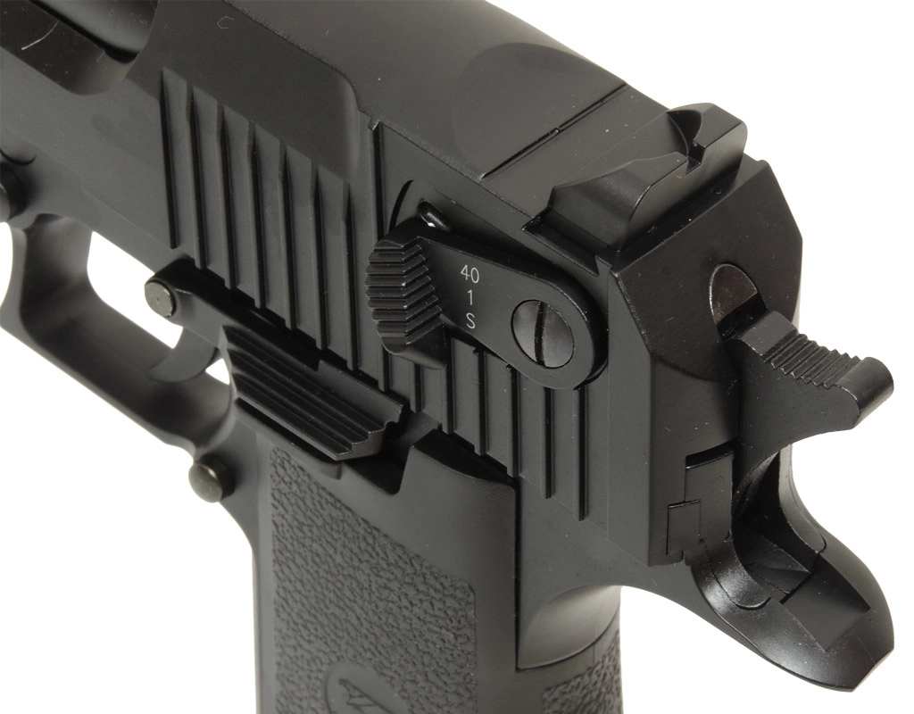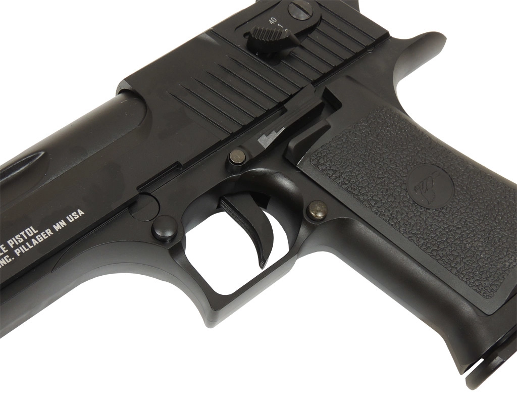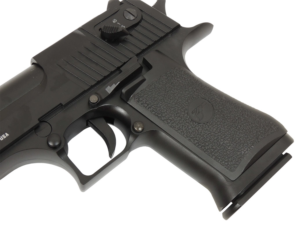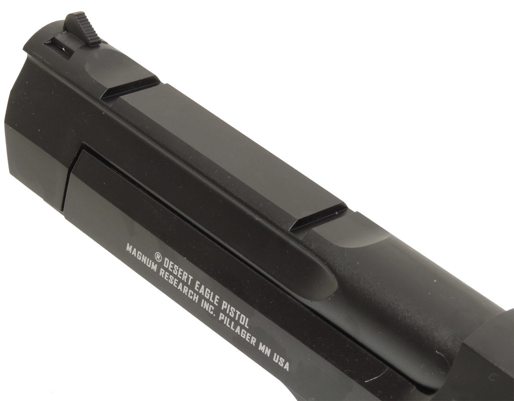 Le Desert Eagle est le pistolet semi-automatique le plus puissant du monde, conçu par la firme américaine Magnum Research puis redessiné par IMI « Israeli Military Industries ». La particularité du Desert Eagle réside dans le fait qu'il est actionné par un système d'emprunt de gaz, normalement utilisé sur les fusils d'assauts et les mitrailleuses, ce qui lui permet de tirer des munitions très puissantes. Sa puissance de feu lui a valu une notoriété certaine. Représenté largement dans les jeux vidéo comme « Counter-Strike », « Call of Duty » et les plus gros blockbusters cinématographiques « Matrix », « Bad boys », il est devenu une icône dans le monde entier. Qui a dit que la taille ne comptait pas ? Le pistolet d'airsoft Desert Eagle 50AE surprendra même le plus coriace de vos adversaires grâce à ses finitions remarquables. Il conviendra parfaitement aux joueurs à la recherche d'une réplique de poing originale, fiable, robuste, précise et puissante. Cette réplique jouit d'une excellente réputation et est très appréciées des joueurs car elle est dotée d'un « Kick » MONSTRUEUX ! (Kick = effet de recul) Une conception de qualité Le Desert Eagle est équipé d'une culasse conçue entièrement en métal et d'un corps fabriqué en ABS (thermoplastique, très résistant aux chocs et au vieillissement) afin d'accentuer le réalisme de la réplique. Quels sont les éléments en métal ? La culasse Le chargeur Le bouton d'extraction du chargeur La queue de détente La sécurité Le chien Quels sont les éléments en ABS ? Le lower (partie inférieure de la réplique) Les organes de visée