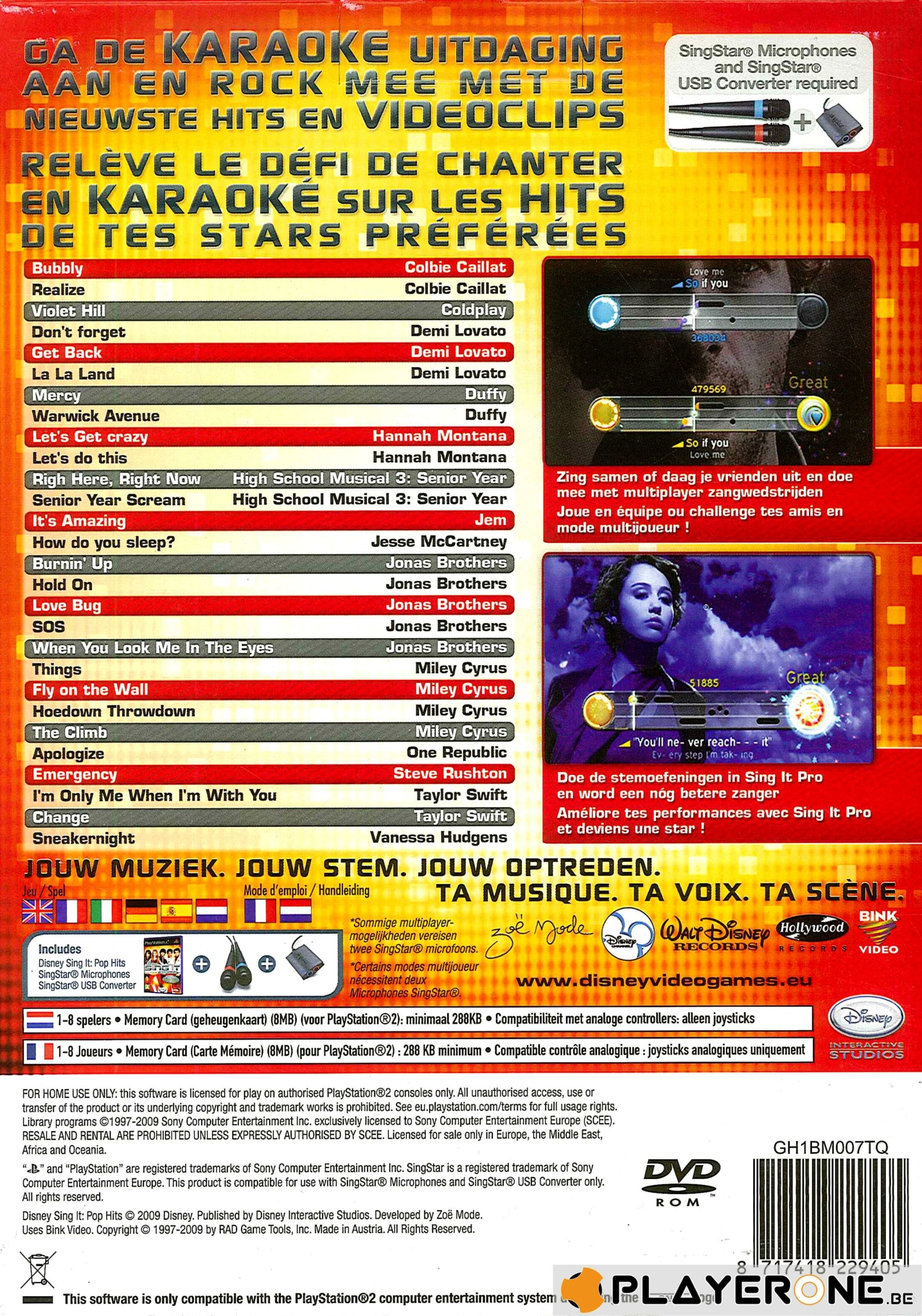 Disney Sing it : Pop Hits sur PS2 est un jeu de karaoké sur fond vidéo. Ce troisième volet de la série Sing it propose des chansons et des vidéos musicales tirées des favoris de Radio Disney tels que Miley Cyrus, Taylor Swift, The Jonas Brothers, Demi Lovato and Hannah Montana. De nombreux hits sont aussi disponibles, tirés d'artistes tels que Colbie Caillat, Coldplay et One Republic.