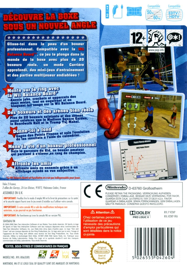 Don King Boxing est un jeu de boxe sur Wii. Entraînez-vous, suivez une évolution progressive de votre personnage et devenez le meilleur boxeur de tous les temps. Le titre vous propose différents modes de jeu pour vous aguerrir et gagner de l'expérience pour vos combats. Faites les bons choix et les sacrifices pour accéder à l'élite mondiale.