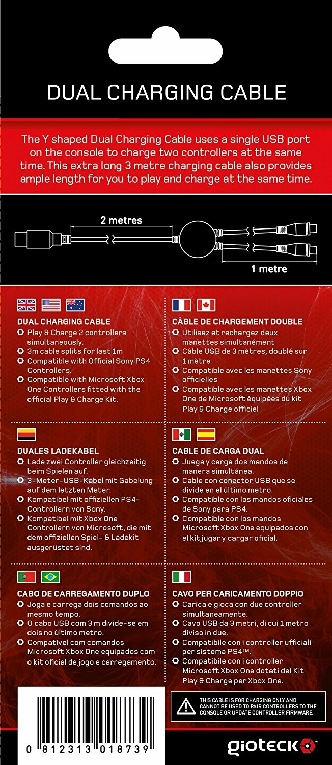 Ce câble en Y vous permet de recharger simultanément deux manettes depuis un seul port USB de votre console PS4 ou Xbox One.
