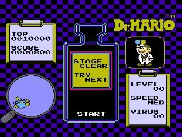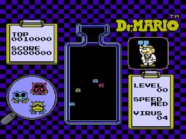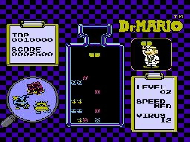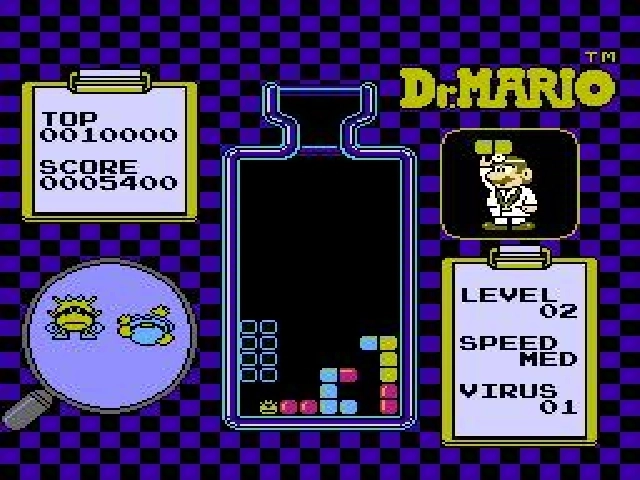 Dr. Mario sur Nes est un puzzle-game proche de Tetris dont le but est d'aligner des gélules de la même couleur afin de les faire disparaître. Avec le temps, les gélules descendent de plus en plus vite et votre adversaire enverra des pièges pour vous ralentir. Faites de même en enchaînant les combos et endiguez l'invasion de bactéries.