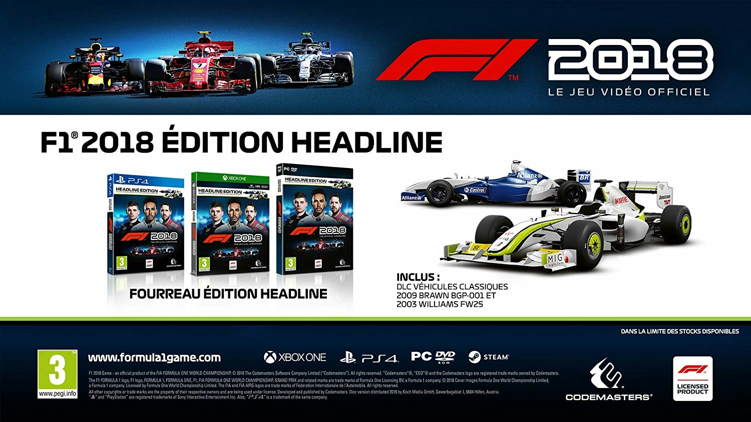 F1 2018 Headline Edition est le jeu de course officiel du championnat du monde de Formule 1 sur XBOX ONE. Il propose tout le contenu officiel de la saison en cours, tels que les grands prix, les sponsors, les pilotes mais aussi les véhicules et les circuits.