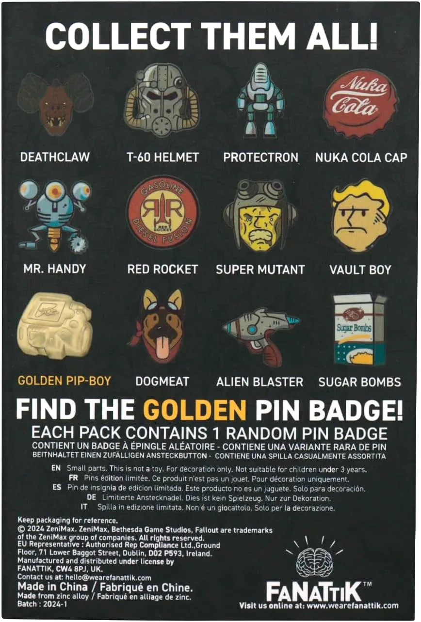 Découvrez l’univers culte de Fallout avec ces badges mystères officiels à collectionner ! Chaque boîte contient un badge en métal aléatoire, représentant un symbole emblématique de la franchise : Dogmeat, Nuka Cola, Vault Boy, Mr. Handy, Red Rocket, Super Mutant… et bien d'autres !