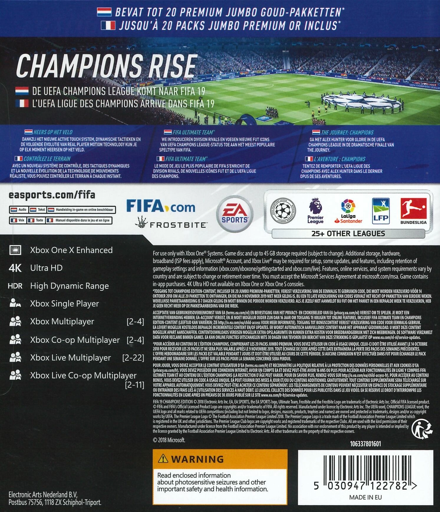 *Créez votre équipe de rêve avec des mises à jour de contenu UEFA Champions League et Europa League en direct dans FIFA 19 Ultimate Team. Où que vous soyez et quel que soit votre niveau à FIFA 19, vous pouvez disputer la plus prestigieuse des compétitions de clubs de football au monde.FIFA 19 est le cadre du final intense des aventures d'Alex Hunter. Vivez le quotidien, sur le terrain et en dehors, de cette icône du football à la recherche de la gloire en UEFA Champions League.