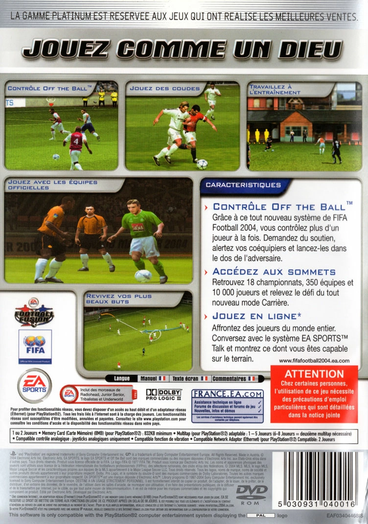 FIFA Football 2004 édition Platinum sur PS2 est une simulation de football réaliste. Retrouvez dix-huit championnats, trente-huit équipes nationales et 11 000 joueurs.