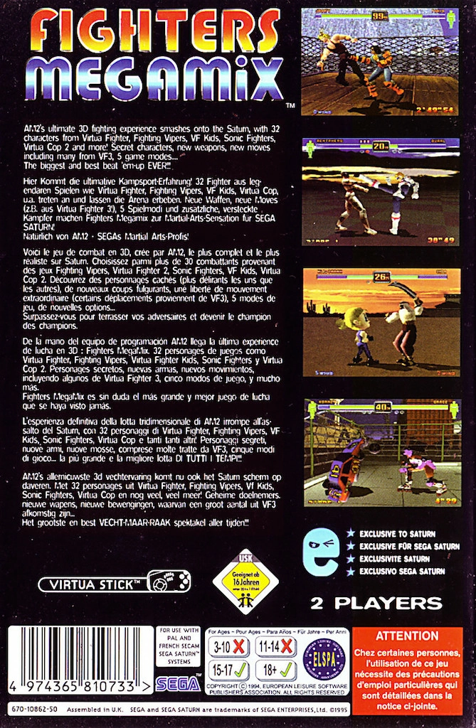 Fighters Megamix sur Saturn est un jeu de combat reprenant les personnages du jeu Virtua Fighter 2 pour les plonger dans les classiques modes que l'on peut trouver dans ce dernier, mais aussi dans de nouvelles variantes qui se veulent plus accessibles et plus fun ! Il y a en tout pas moins de 32 personnages, dont dix sont à débloquer !