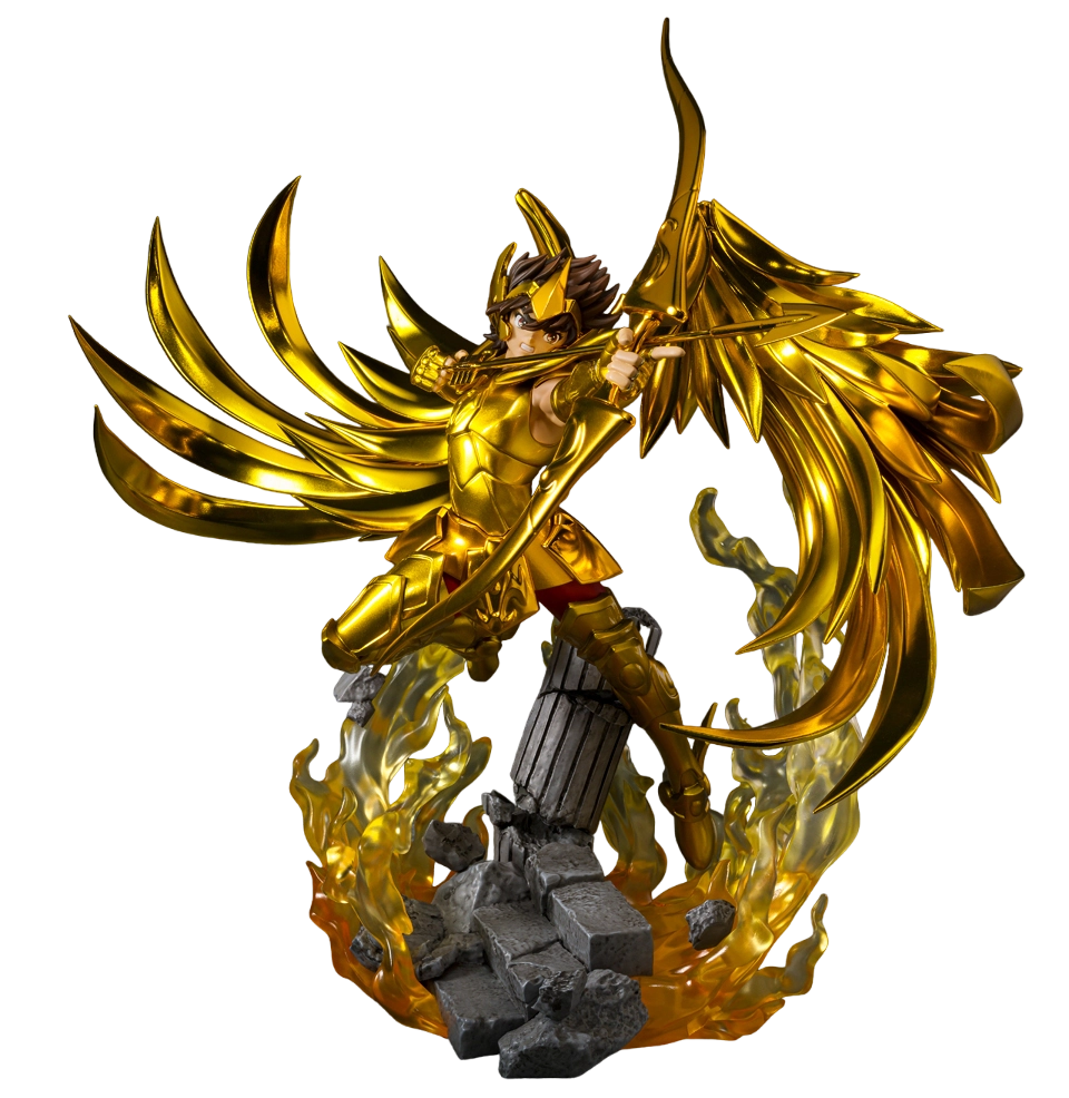 Cette figurine exceptionnelle capture Seiya dans une pose dynamique, prêt à décocher sa flèche, avec des détails métalliques saisissants qui reflètent chaque facette de son armure d'or.