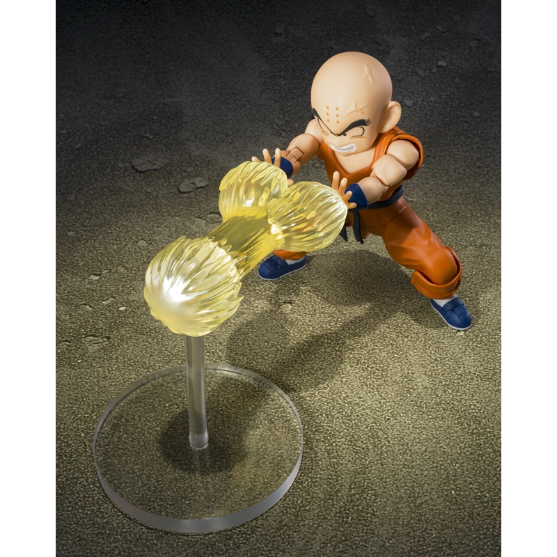 La figurine mesure environ 11 cm de haut et comprend cinq paires de mains interchangeables, quatre visages expressifs, ainsi qu’un effet spécial d’attaque pour recréer la Scattering Energy Wave, célèbre technique de Krilin dans l’anime.