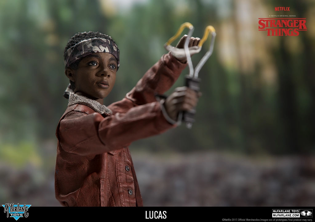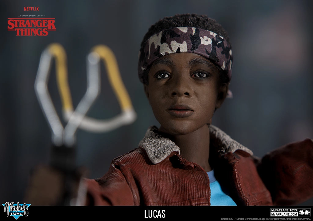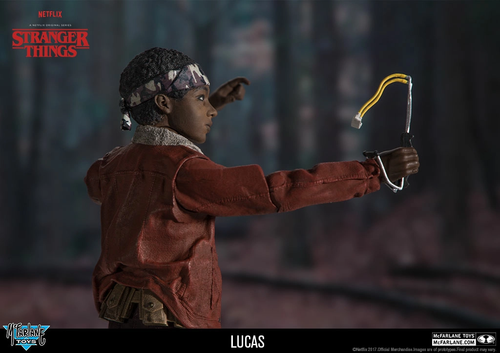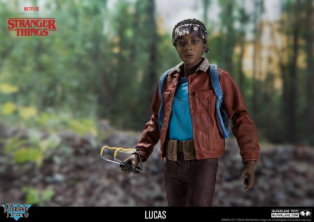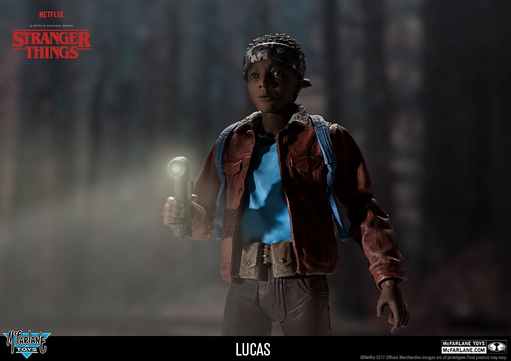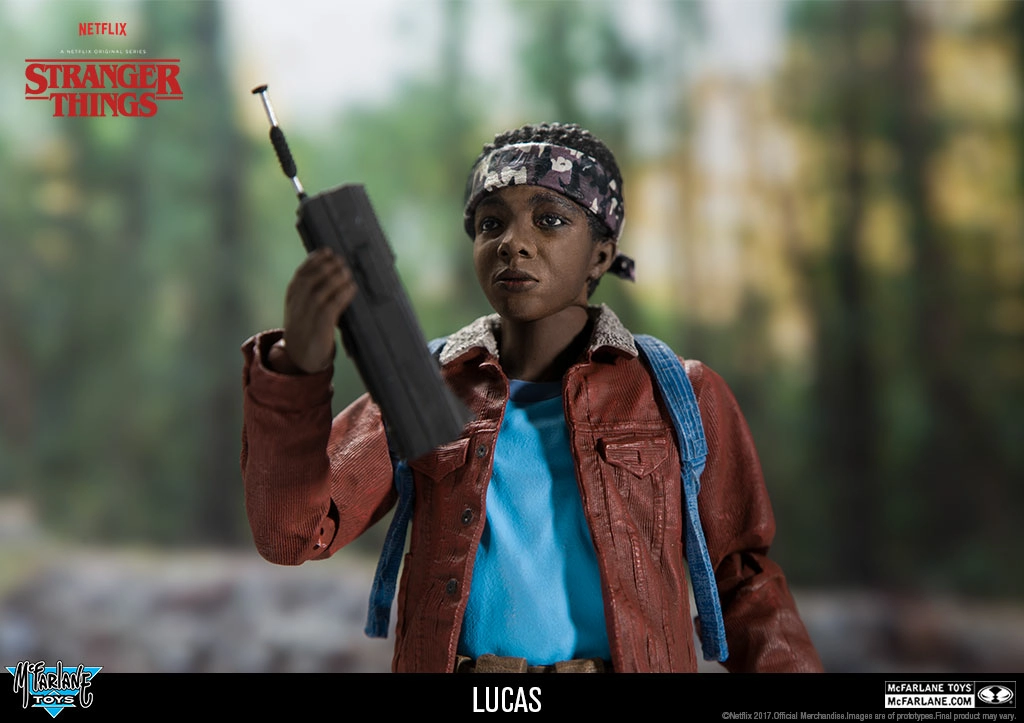 - La figure est en vedette dans la tenue portée par Lucas dans Stranger Things avec un bandeau commando emblématique et une veste en velours côtelé