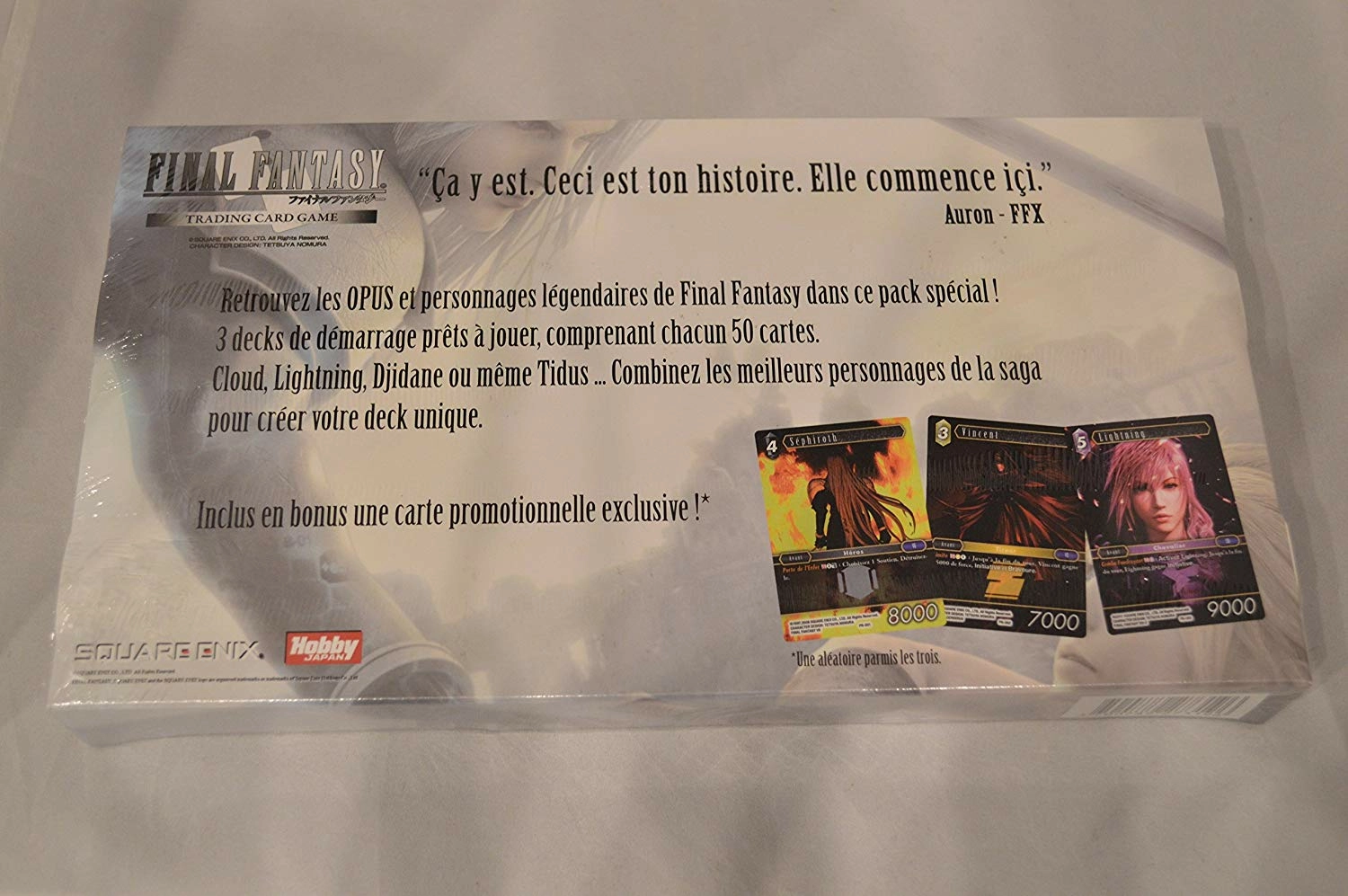 Ce pack regroupe trois Sets de démarrage Final Fantasy, soit 150 cartes au total ! Construisez votre jeu en fonction de votre affinité pour les éléments (feu, eau, glace, terre, vent, éclair...). Utilisez les personnages et creatures de tous les univers Final Fantasy, associez Tidus à Sephiroth ou encore Zidane à Clad ! Vous pouvez utiliser dans votre deck tous vos personnages préférés !