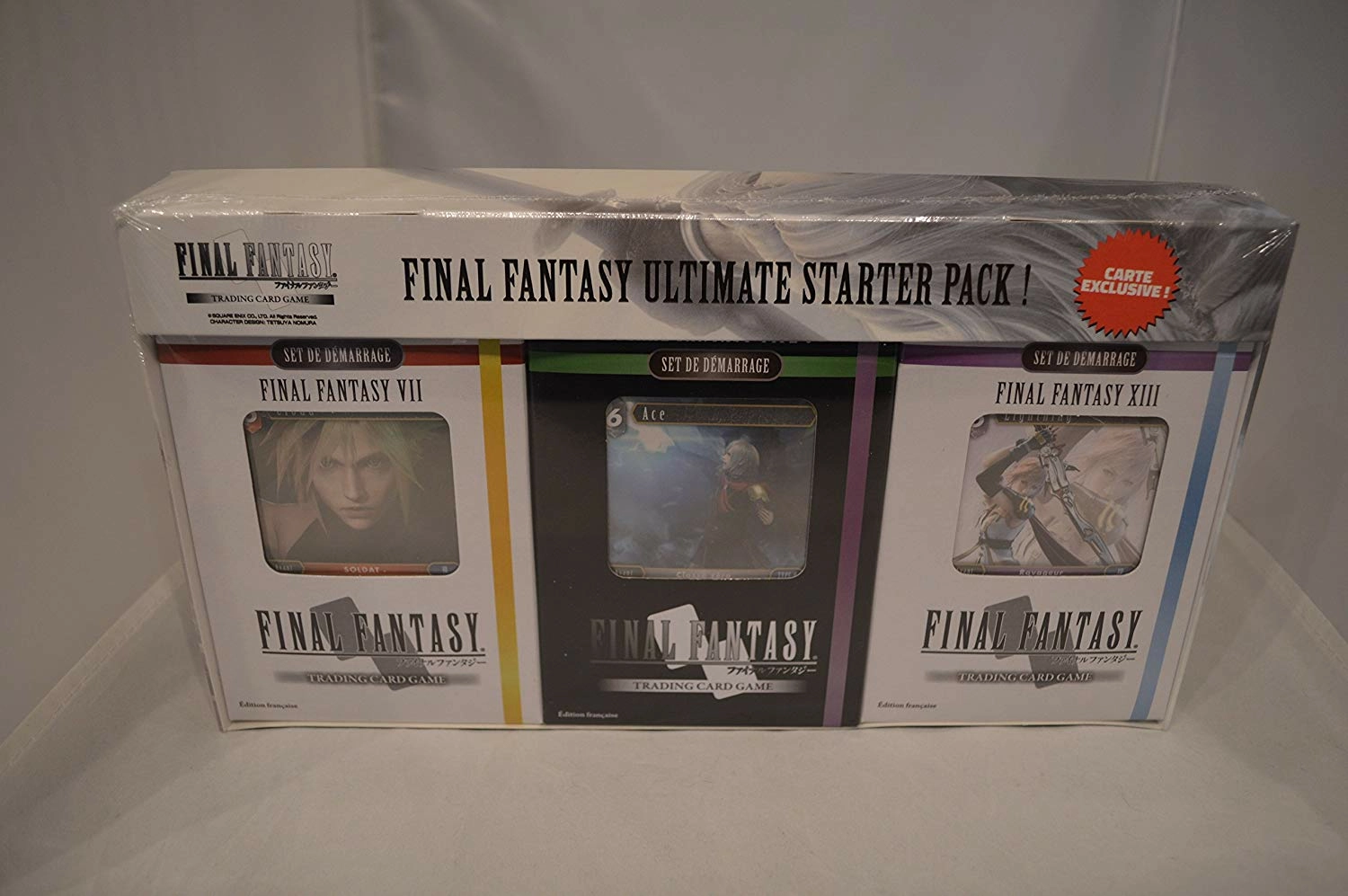 Set de démarrage Final Fantasy VII : 50 cartes Feu et Terre dont 10 cartes exclusives (5 de chaque élément), tapis de jeu, régles du jeu Set de démarrage Final Fantasy TYPE-0 : 50 cartes Vent et Éclair dont 10 cartes exclusives (5 de chaque élément), tapis de jeu, régles du jeu Set de démarrage Final Fantasy XIII : 50 cartes Glace et Éclair dont 10 cartes exclusives (5 de chaque élément), tapis de jeu, régles du jeu