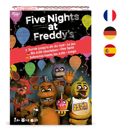 Vous êtes l'agent de sécurité de nuit d'une pizzeria Freddy Fazbear's, et il est de votre devoir de vérifier les caméras de sécurité et de maintenir l'équipement en bon état de marche.... et de vous méfier des animatroniques qui s'activent d'eux-mêmes la nuit ! À chaque tour, vous vérifiez les caméras et réagissez aux mouvements dans l'obscurité. Choisissez d'allumer les lumières ou de fermer les portes pour vous protéger, mais attention ! Chaque réaction épuise votre énergie limitée. Empêchez Freddy et ses amis d'entrer dans votre bureau jusqu'à ce que vous puissiez pointer à 6 heures du matin !Points forts :Jeu de Prospero HallA partir de 13 ansPour 1 ou 2 joueursDurée du jeu : 20 minutesVersion Française, Allemande et Espagnole