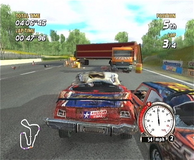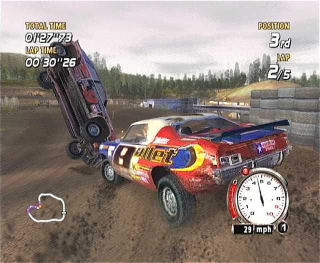FlatOut est un jeu de courses sur Xbox où tous les moyens sont bons pour tenter de remporter la victoire. Au volant de votre bolide, poussez vos adversaires dans le décor et provoquez de nombreux accidents afin de prendre la tête de la course. Le titre propose 36 circuits entièrement destructibles, 6 arènes de destruction ainsi que 6 mini-jeux différents.