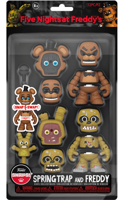 La ligne SNAPS ! de Funko apporte le plaisir de la culture pop à un public plus jeune ! Composés de dizaines de pièces interchangeables qui s'emboîtent, ces jouets interactifs permettent aux enfants et aux collectionneurs de démonter, reconstruire et mélanger leurs personnages préférés comme ils le souhaitent !Survivez à la nuit chez Freddy Fazbear en un clin d'œil ! Springtrap et Freddy comprennent chacun six pièces différentes qui s'emboîtent, dont une tête, deux visages interchangeables, un torse, des jambes et un accessoire. Springtrap est livré avec une marionnette à main, tandis que Freddy est livré avec un microphone !Verrouillez les SNAPS ! Springtrap et Freddy et capture-les pour ta collection Five Nights at Freddy's !Pour les 8 ans et plus.