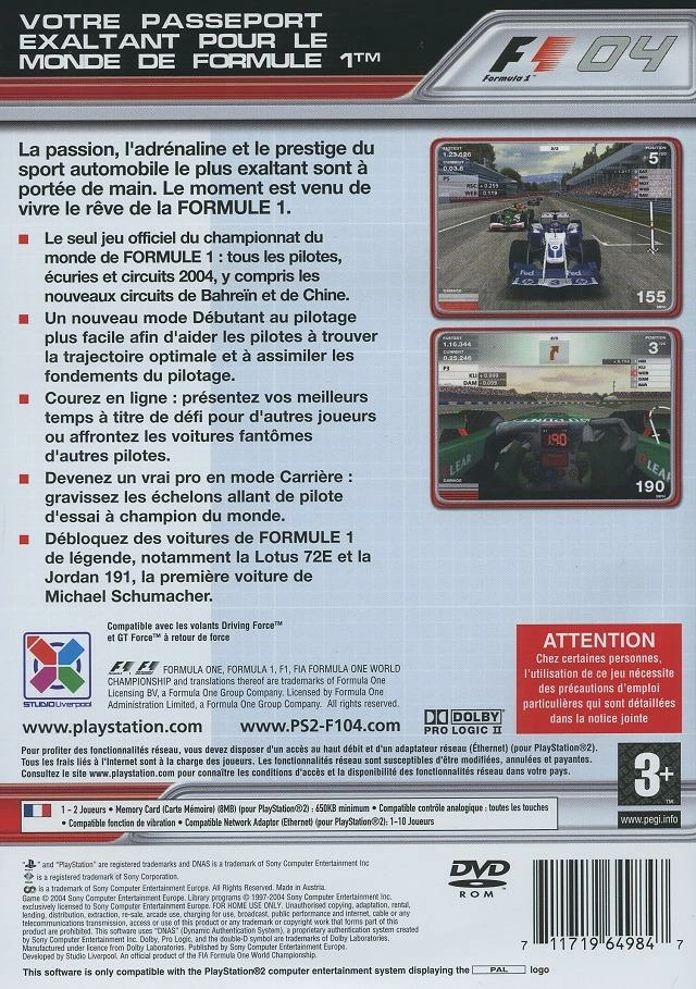 Formula One 04 sur PlayStation 2 est le seul jeu officiel du championnat du monde de la Formule 1 pour la saison 2004. Retrouvez tous les pilotes, écuries, voitures et circuits officiels, y compris ceux de Barheïn et de Chine.