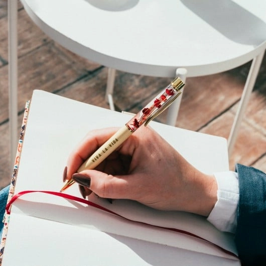 Coffret cadeau de 26,5 x 26,5 x 2,5 cm contenant un stylo et un carnet A5 avec une couverture rigide au toucher doux et mat et aux détails dorés et vernis UV, coins arrondis, reliure cousue, tranche dorée, élastique de fermeture et intérieur pointillé. Comprend 96 feuilles (192 pages) de 100 g/m2. Stylo personnalisé avec de l'huile et des fleurs séchées à l'intérieur.